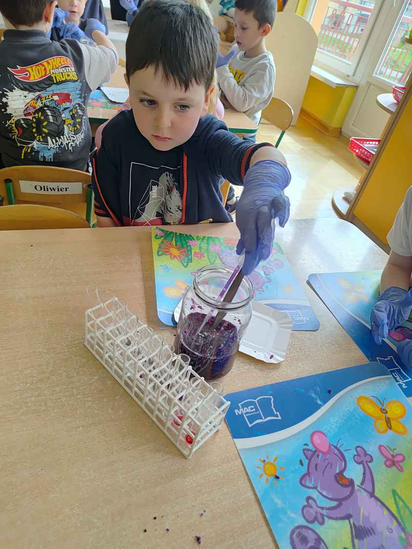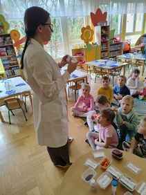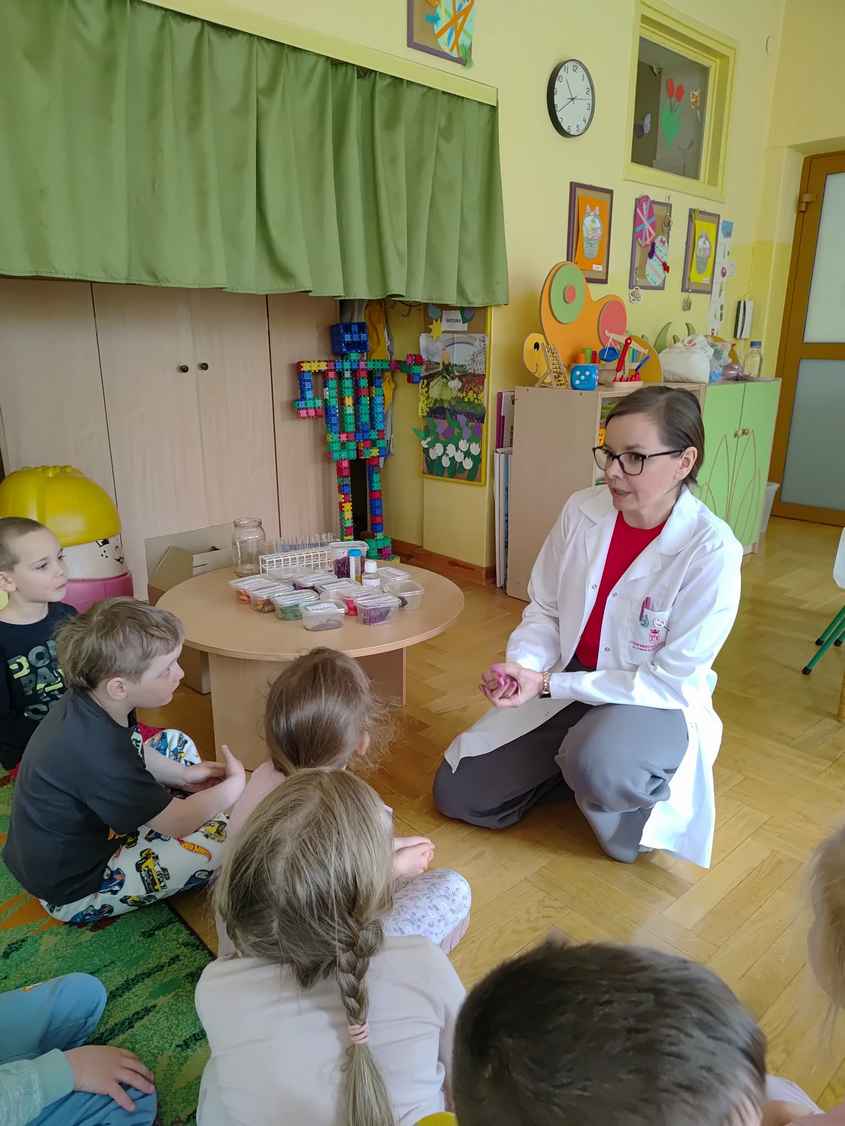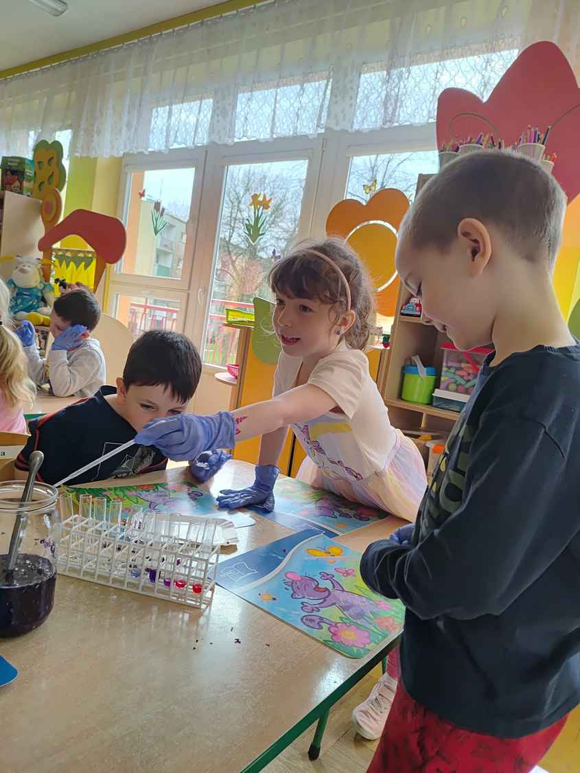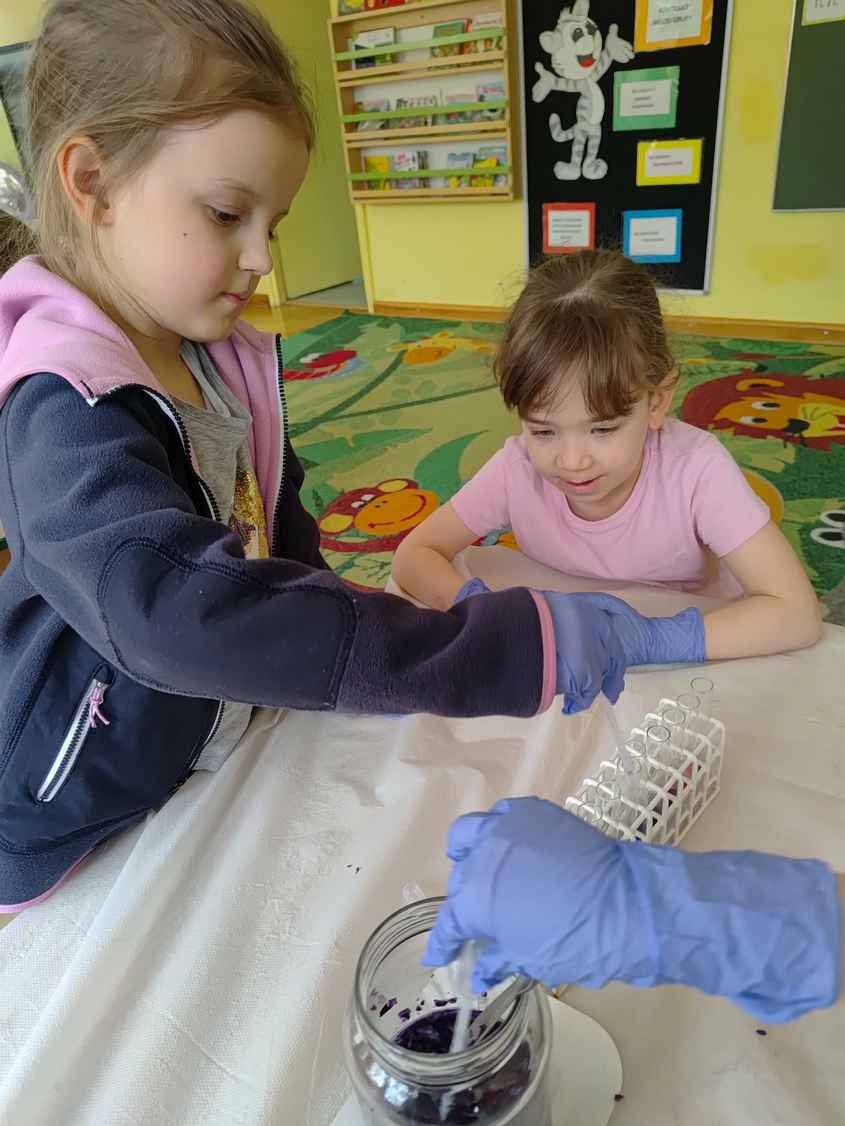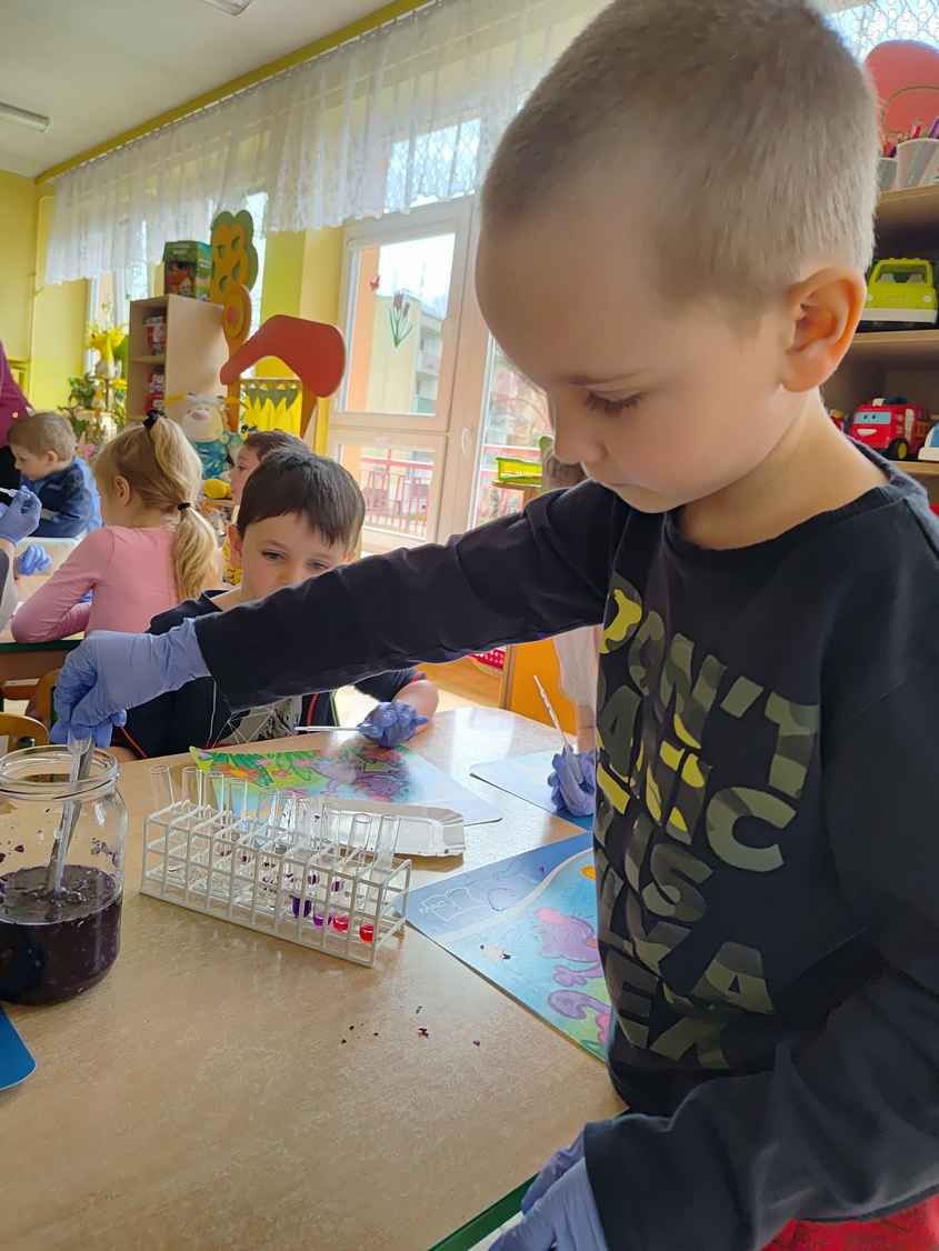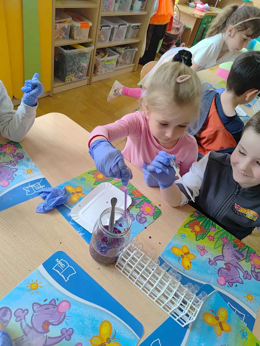 14-04-2026 r. Kotki gościły mamę Artura, która wykonuje zawód naukowca. Przedszkolaki wzięły udział w warsztatach Barwy natury, podczas których miały okazję dowiedzieć się jakie barwy występują w naturze, poznać różne barwniki, usłyszeć jakie jest ich znaczenie w diecie człowieka. Dzieci dowiedziały się, które ze znanych im produktów spożywczych barwione są barwnikami naturalnymi, a które chemicznymi, oraz jaki jest ich wpływ na nasze zdrowie. Bardzo serdecznie dziękujemy p. Paulinie za poświęcony czas i bardzo ciekawe warsztaty!!!