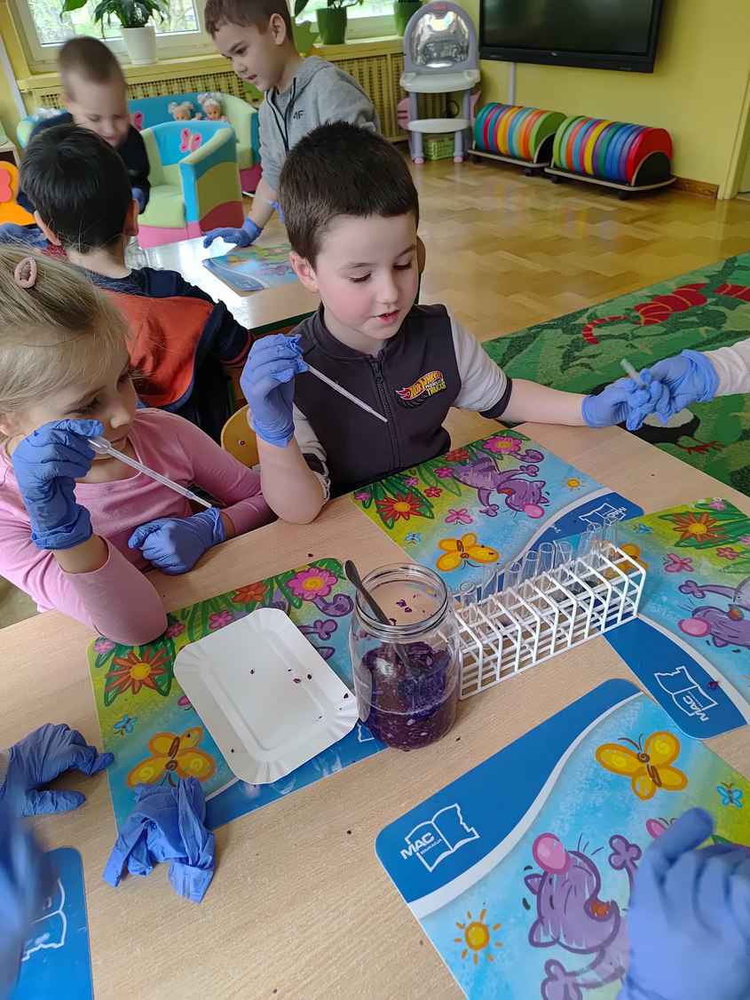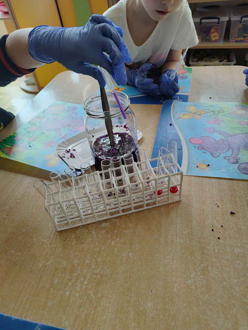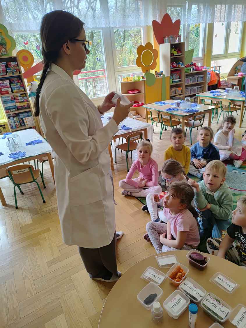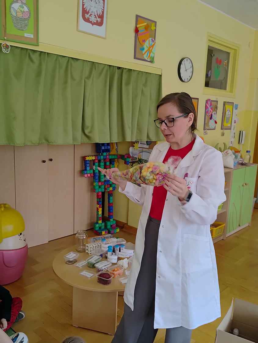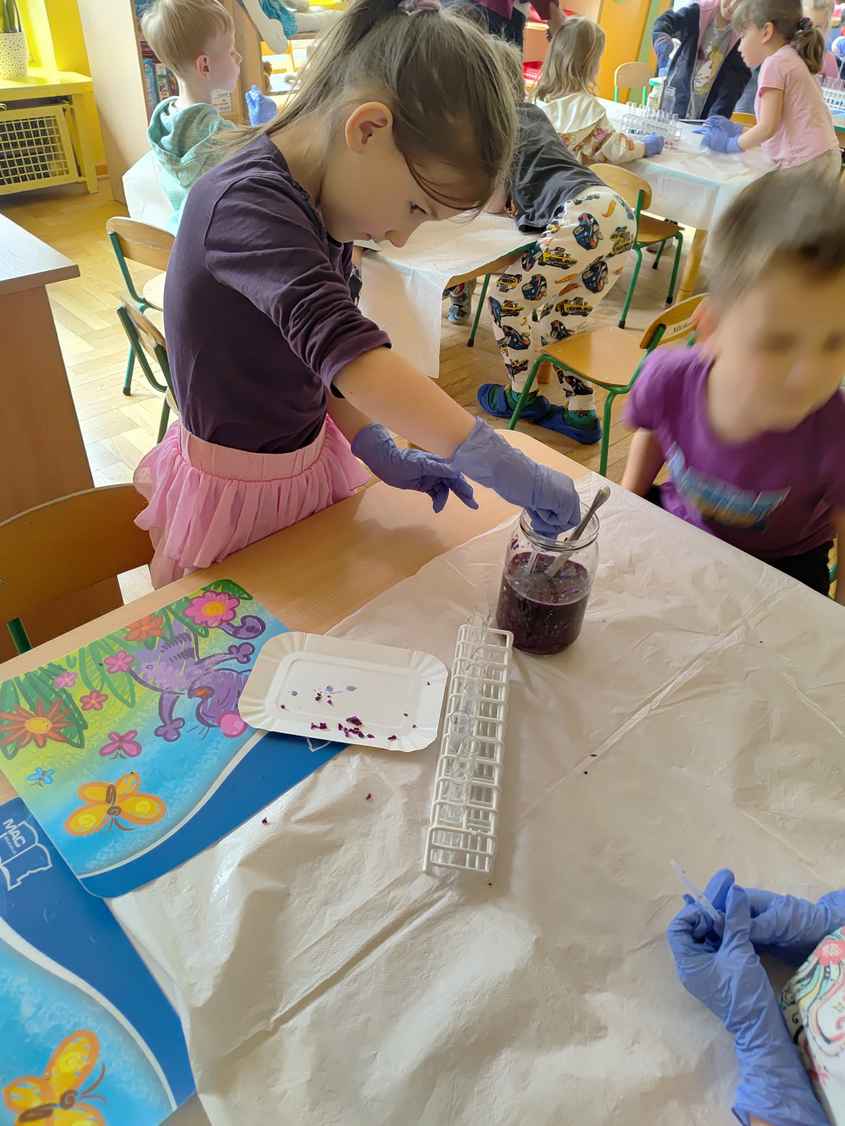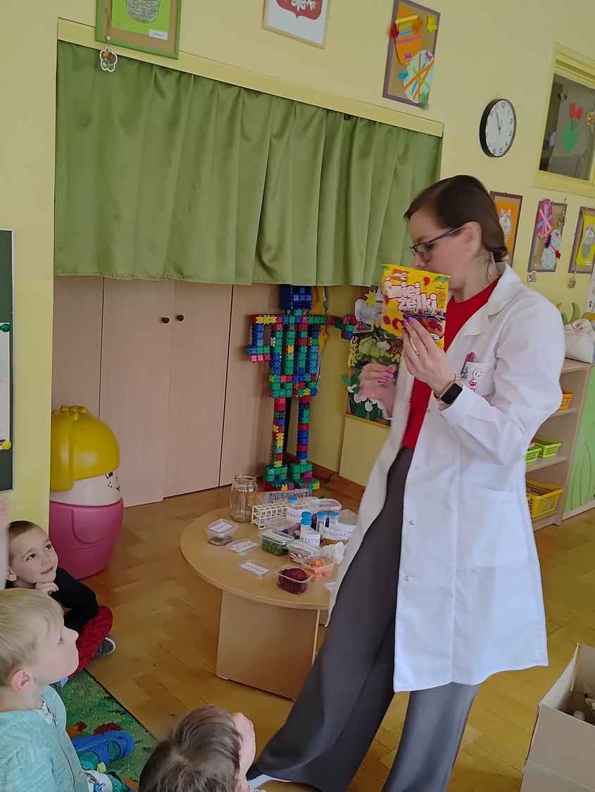 14-04-2026 r. Kotki gościły mamę Artura, która wykonuje zawód naukowca. Przedszkolaki wzięły udział w warsztatach Barwy natury, podczas których miały okazję dowiedzieć się jakie barwy występują w naturze, poznać różne barwniki, usłyszeć jakie jest ich znaczenie w diecie człowieka. Dzieci dowiedziały się, które ze znanych im produktów spożywczych barwione są barwnikami naturalnymi, a które chemicznymi, oraz jaki jest ich wpływ na nasze zdrowie. Bardzo serdecznie dziękujemy p. Paulinie za poświęcony czas i bardzo ciekawe warsztaty!!!