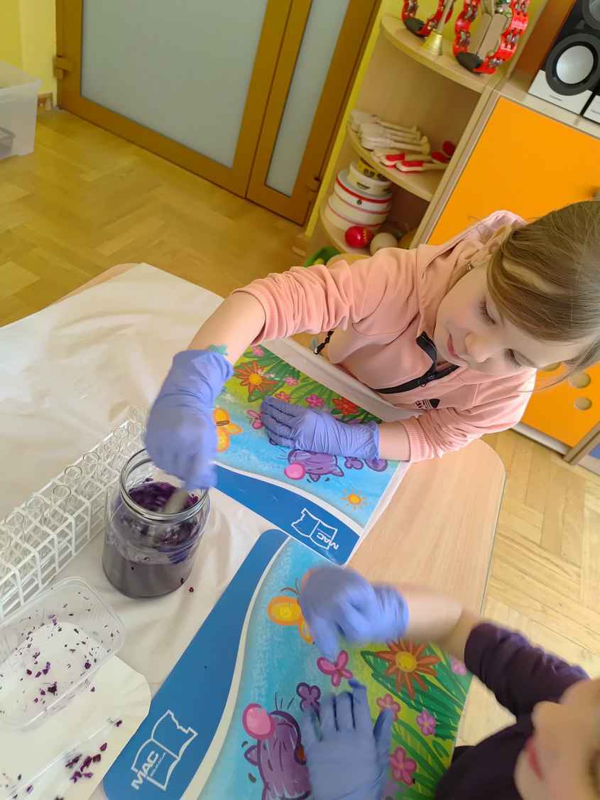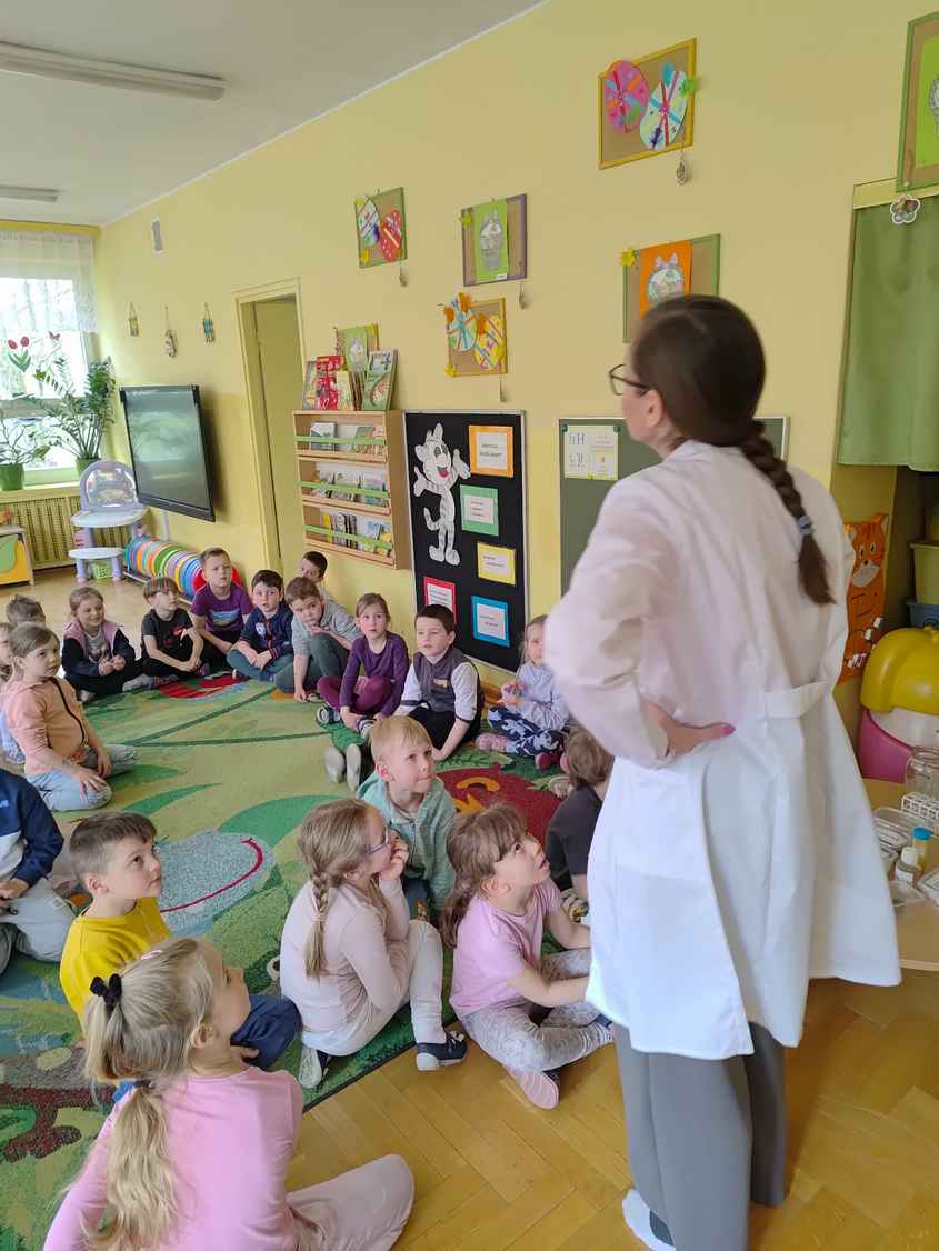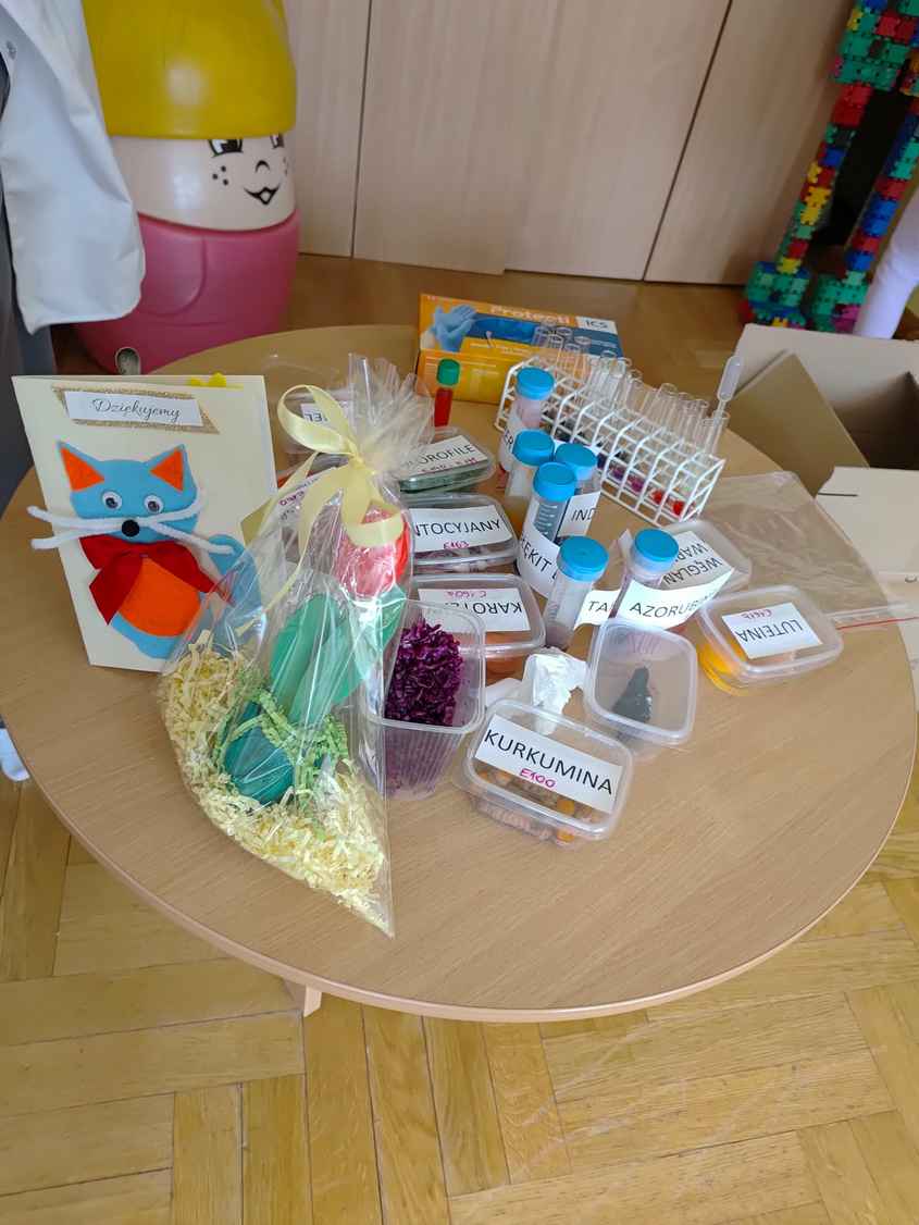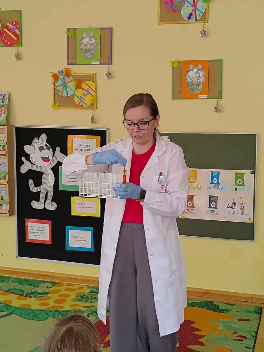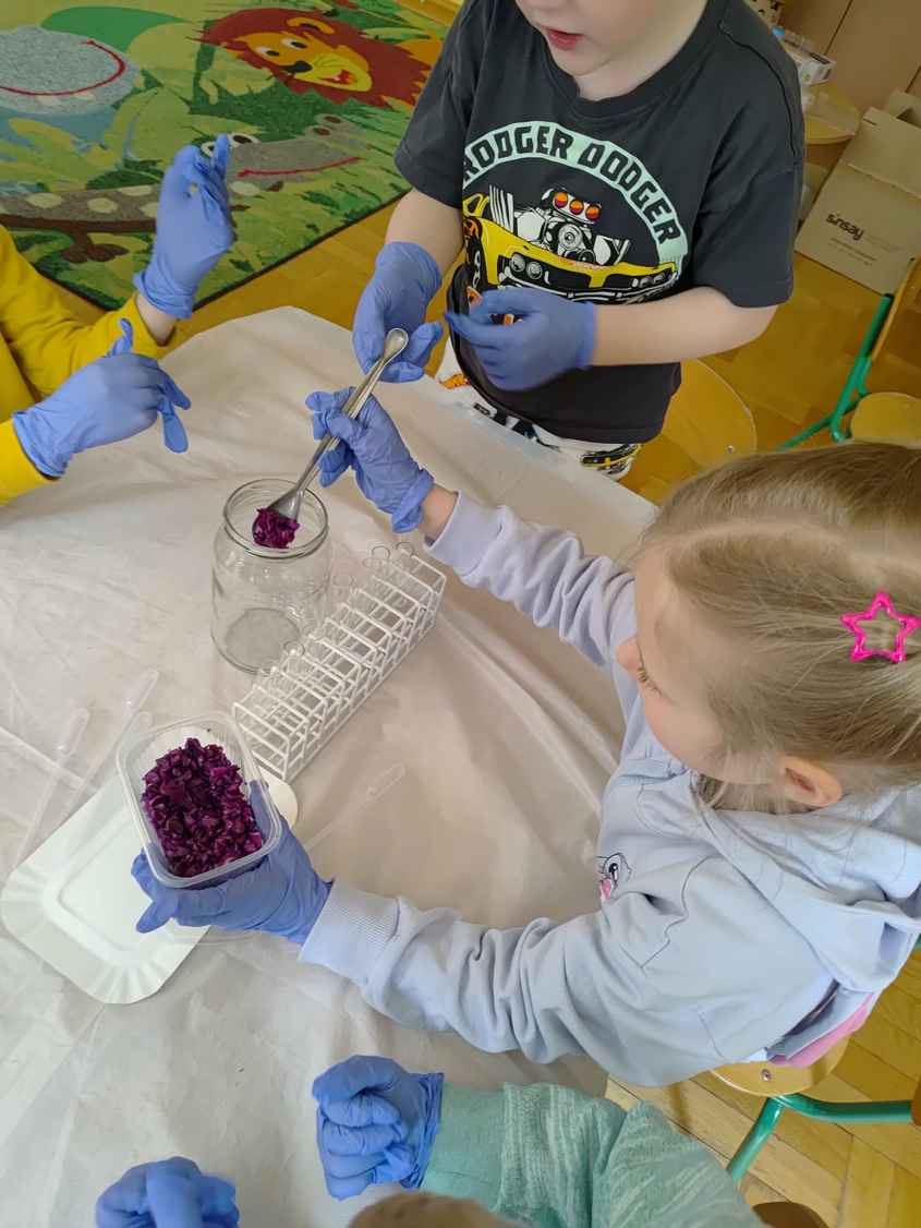 14-04-2026 r. Kotki gościły mamę Artura, która wykonuje zawód naukowca. Przedszkolaki wzięły udział w warsztatach Barwy natury, podczas których miały okazję dowiedzieć się jakie barwy występują w naturze, poznać różne barwniki, usłyszeć jakie jest ich znaczenie w diecie człowieka. Dzieci dowiedziały się, które ze znanych im produktów spożywczych barwione są barwnikami naturalnymi, a które chemicznymi, oraz jaki jest ich wpływ na nasze zdrowie. Bardzo serdecznie dziękujemy p. Paulinie za poświęcony czas i bardzo ciekawe warsztaty!!!