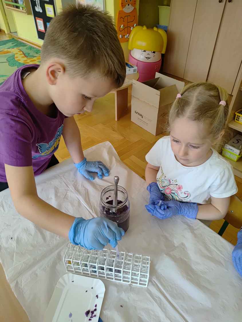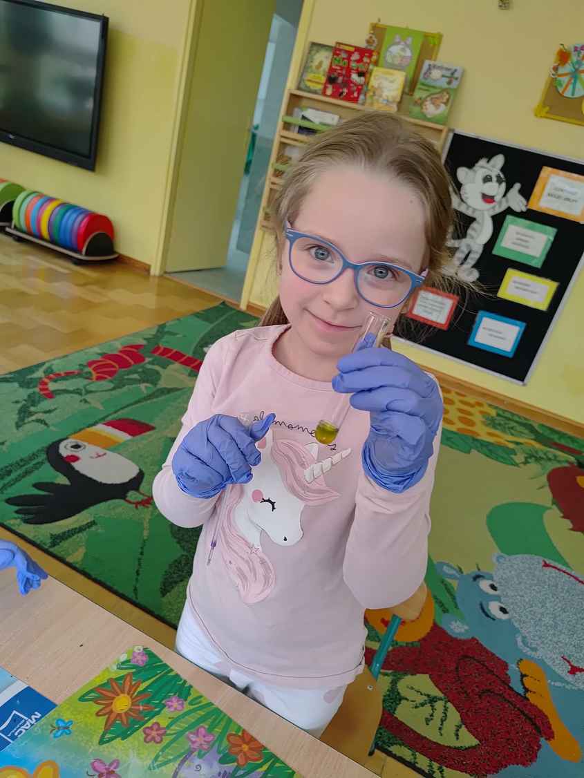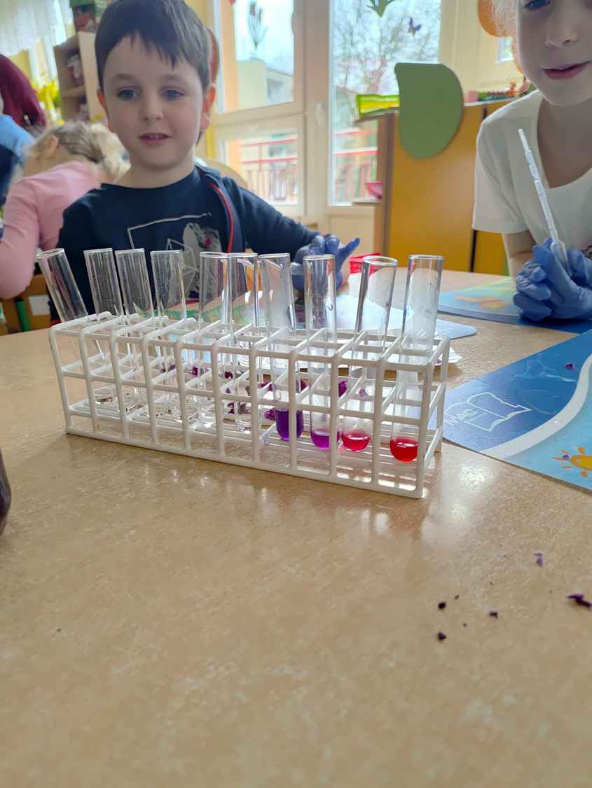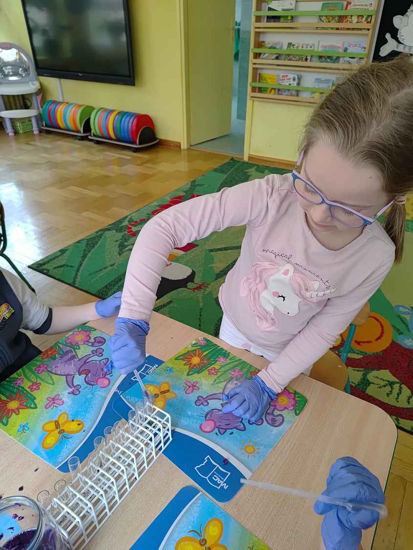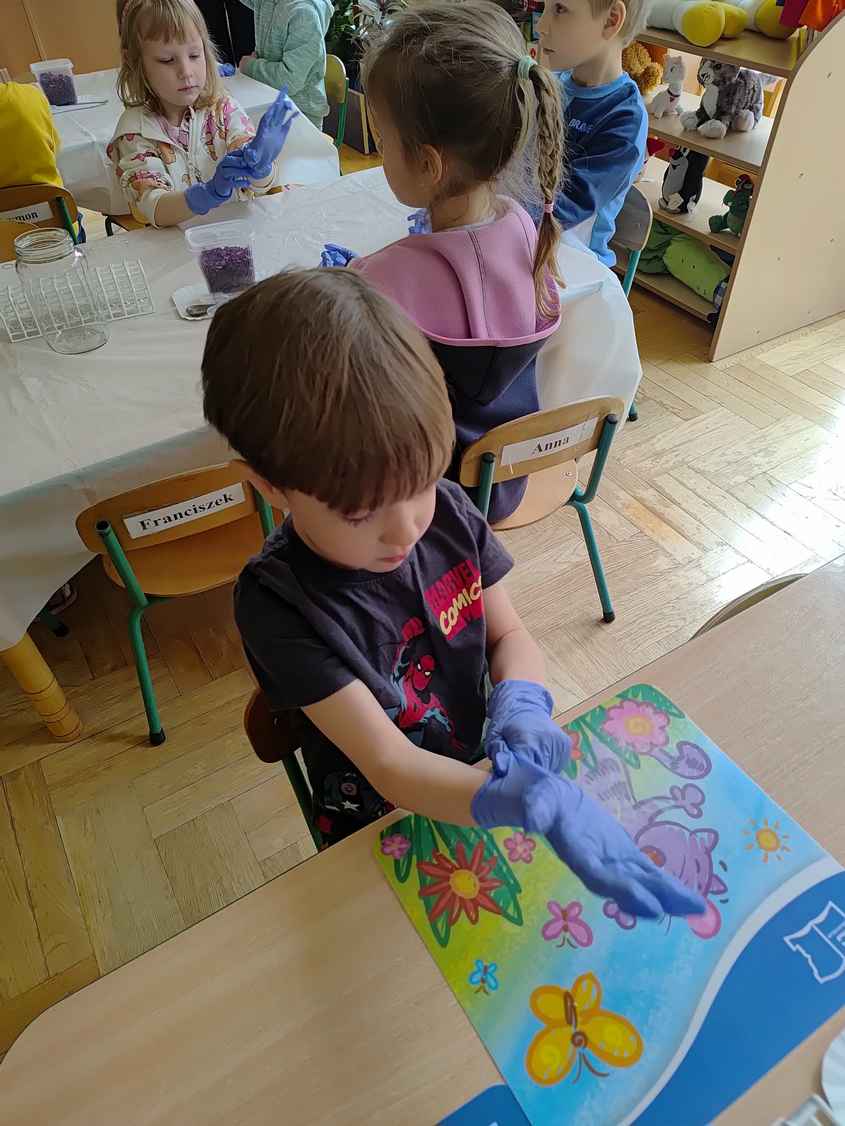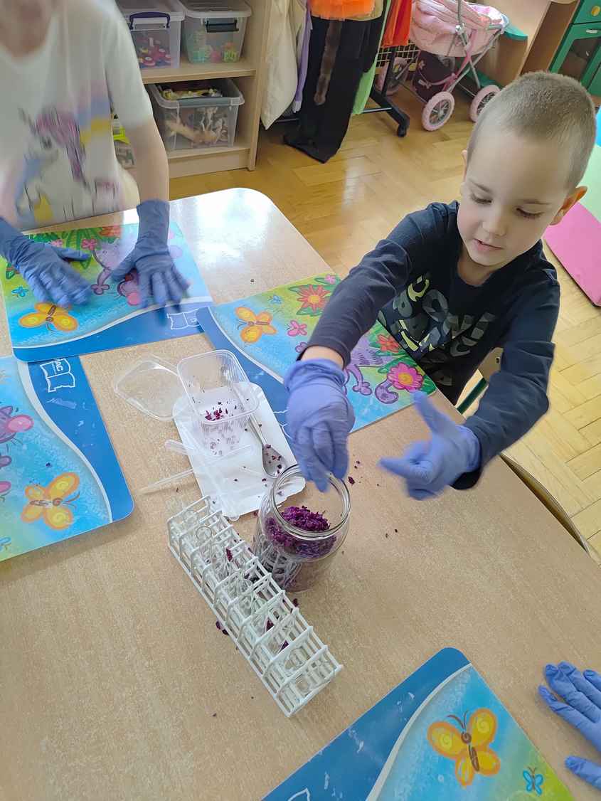14-04-2026 r. Kotki gościły mamę Artura, która wykonuje zawód naukowca. Przedszkolaki wzięły udział w warsztatach Barwy natury, podczas których miały okazję dowiedzieć się jakie barwy występują w naturze, poznać różne barwniki, usłyszeć jakie jest ich znaczenie w diecie człowieka. Dzieci dowiedziały się, które ze znanych im produktów spożywczych barwione są barwnikami naturalnymi, a które chemicznymi, oraz jaki jest ich wpływ na nasze zdrowie. Bardzo serdecznie dziękujemy p. Paulinie za poświęcony czas i bardzo ciekawe warsztaty!!!