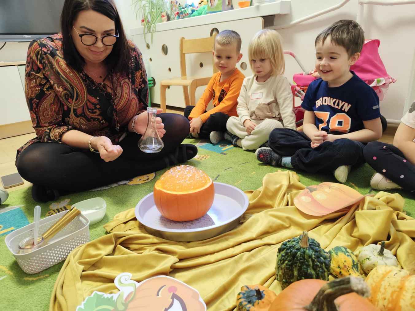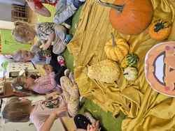 31-10-2025 r. Dzieci z grupy Wiewiórek świętowały dzień dyni. Poznały różne rodzaje dyni, segregowały je ze względu na kształt i kolor. Dowiedziały się, co jest w środku dyni.