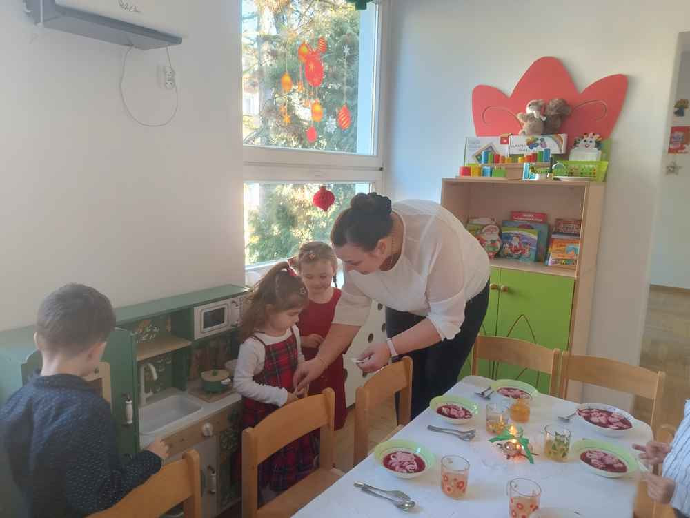 19-12-2025r.- w grupie Wiewióreczek dzieci łamały się opłatkiem, składając sobie życzenia, śpiewały kolędy, następnie usiadły do pięknie nakrytego, wigilijnego stołu.