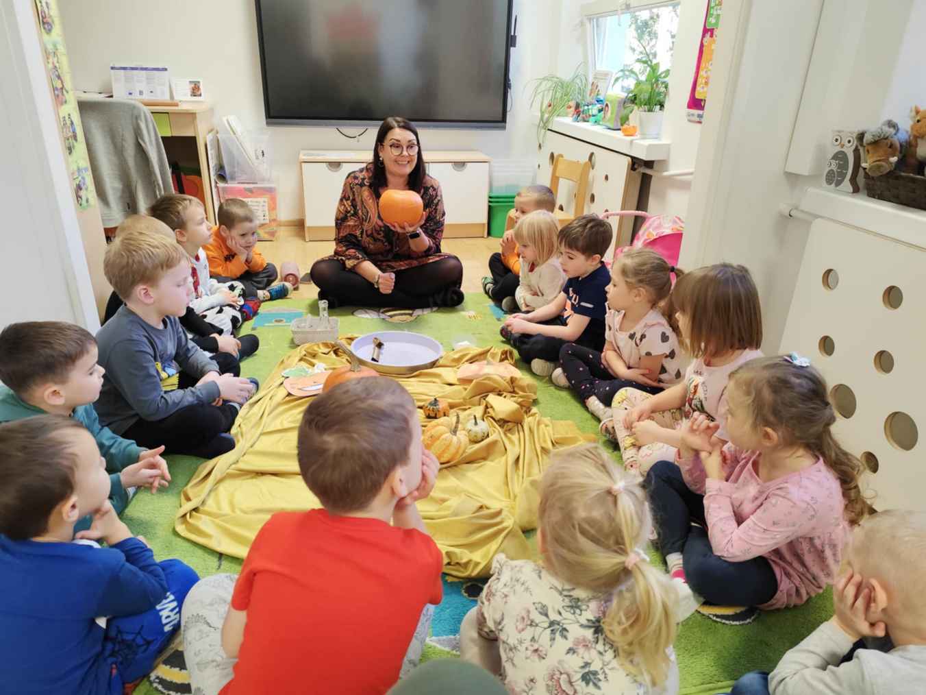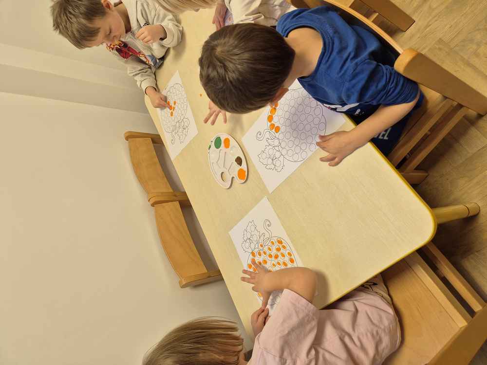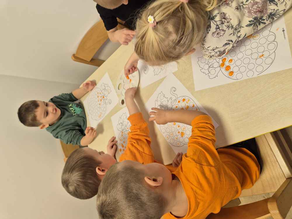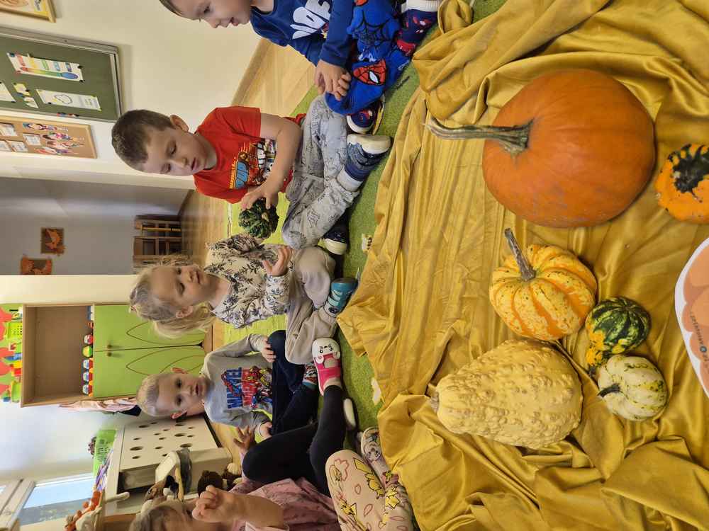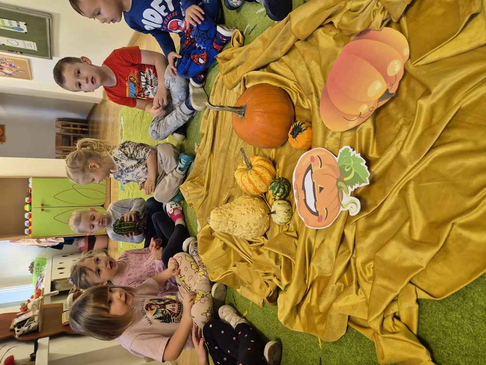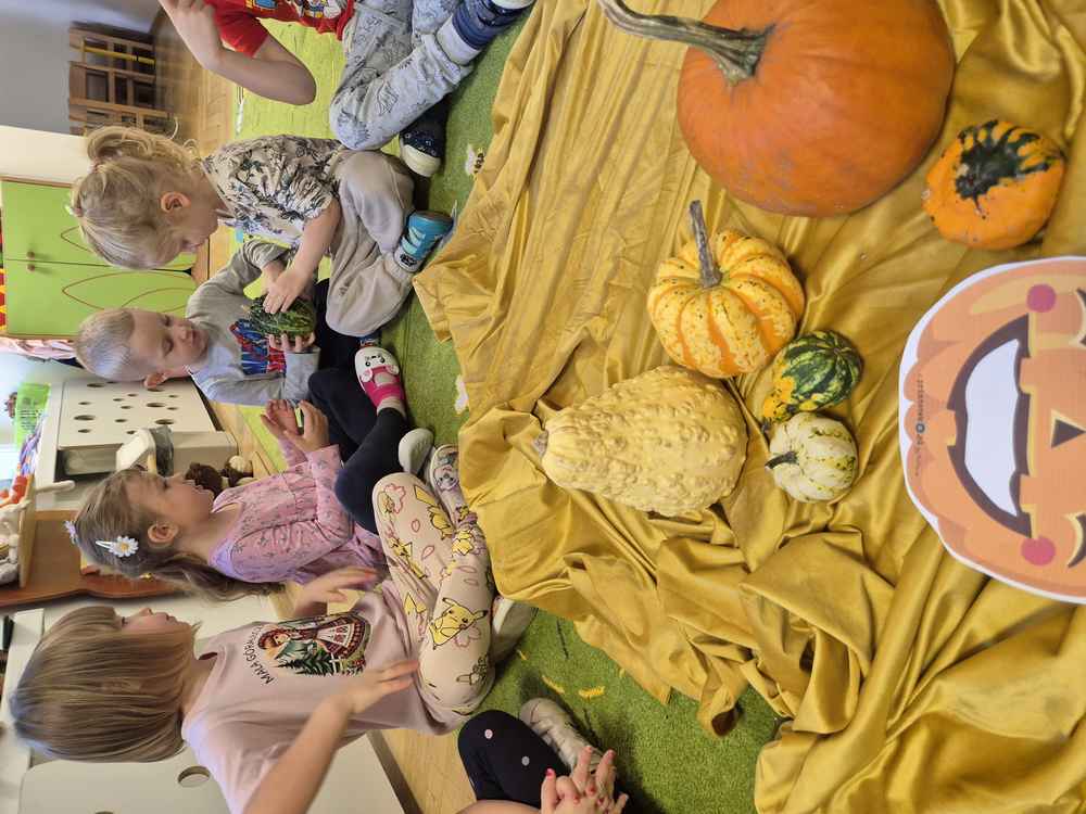 31-10-2025 r. Dzieci z grupy Wiewiórek świętowały dzień dyni. Poznały różne rodzaje dyni, segregowały je ze względu na kształt i kolor. Dowiedziały się, co jest w środku dyni.