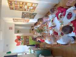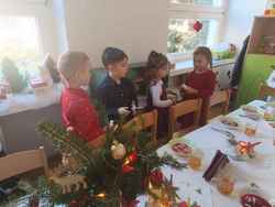 19-12-2025r.- w grupie Wiewióreczek dzieci łamały się opłatkiem, składając sobie życzenia, śpiewały kolędy, następnie usiadły do pięknie nakrytego, wigilijnego stołu.