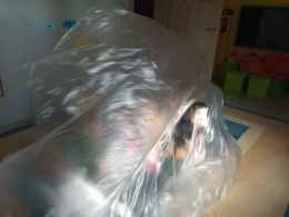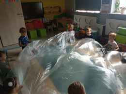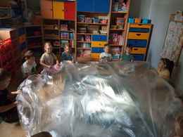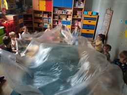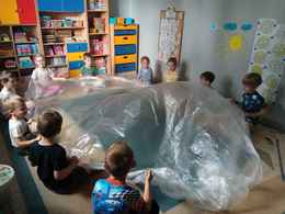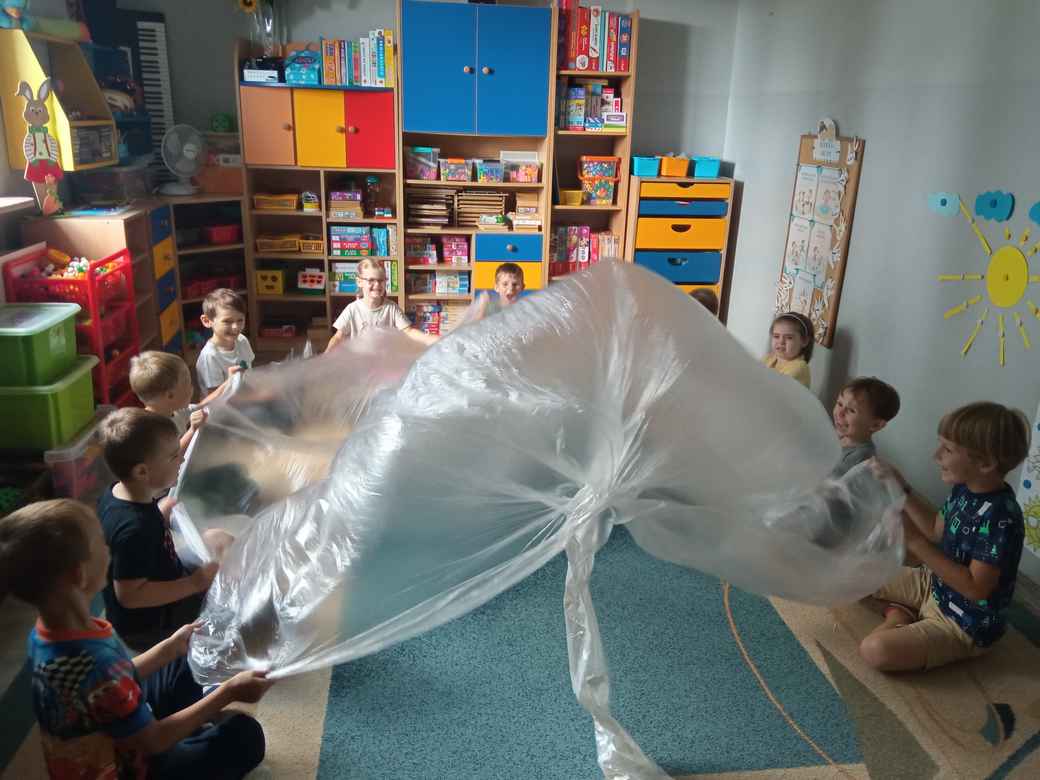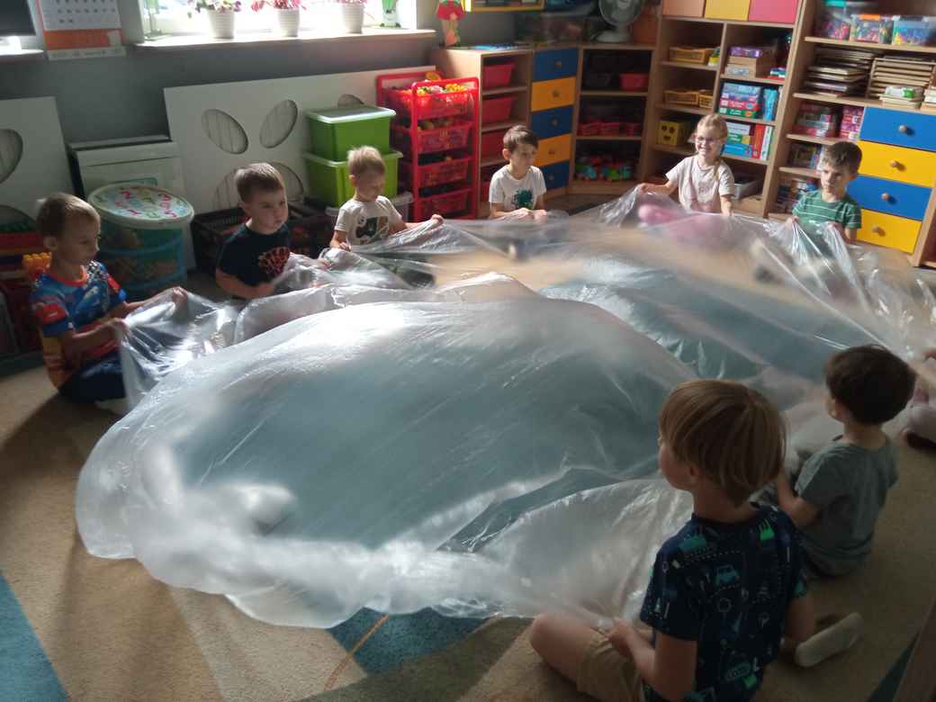 09-09-2025 r. Misie rozmawiały o kolorach, niebieski kojarzy się dzieciom z morzem. Wykorzystując folię malarską stworzyliśmy ilustrację ruchową do rymowanki "Rybki i wieloryb." Falująca folia sprawiła dzieciom dużo radości.