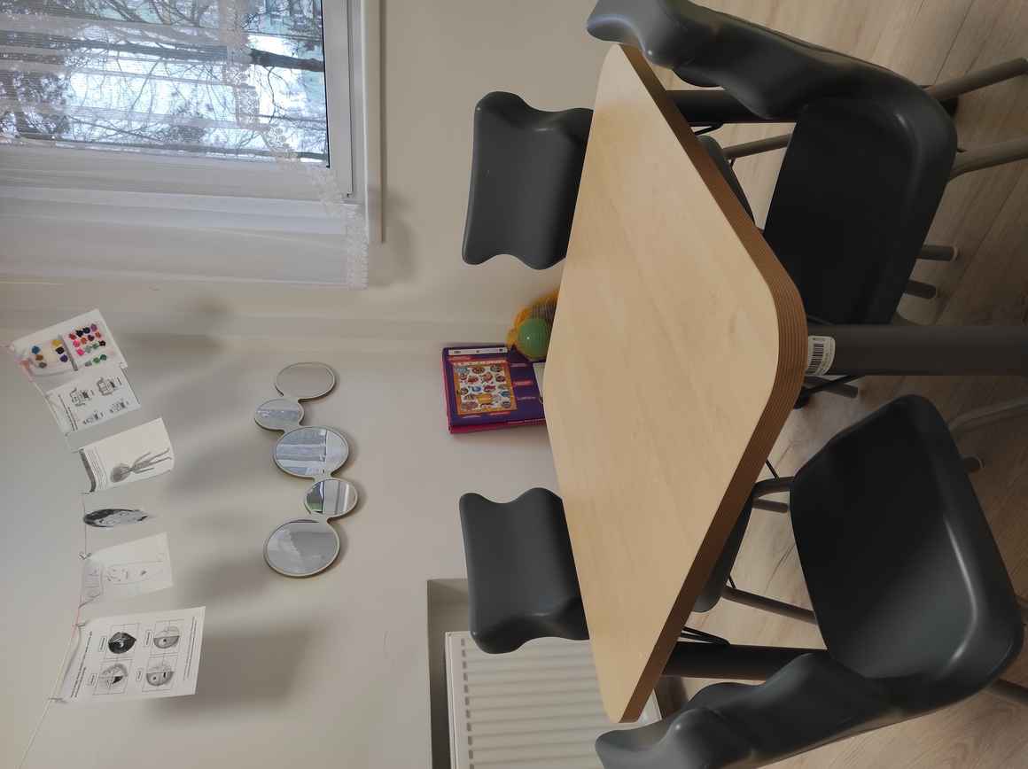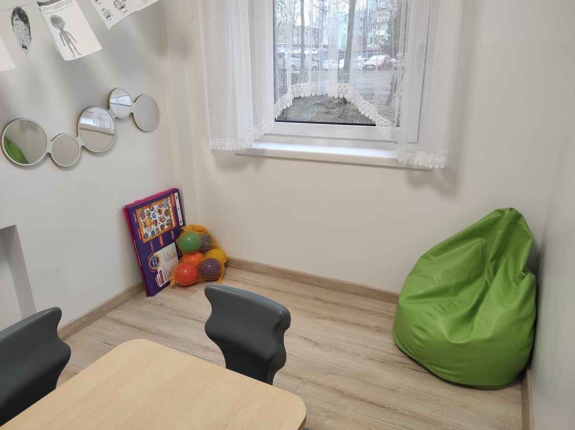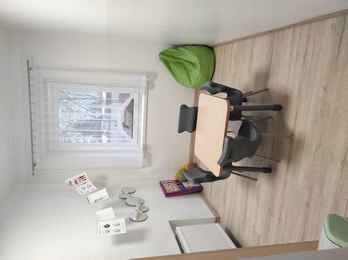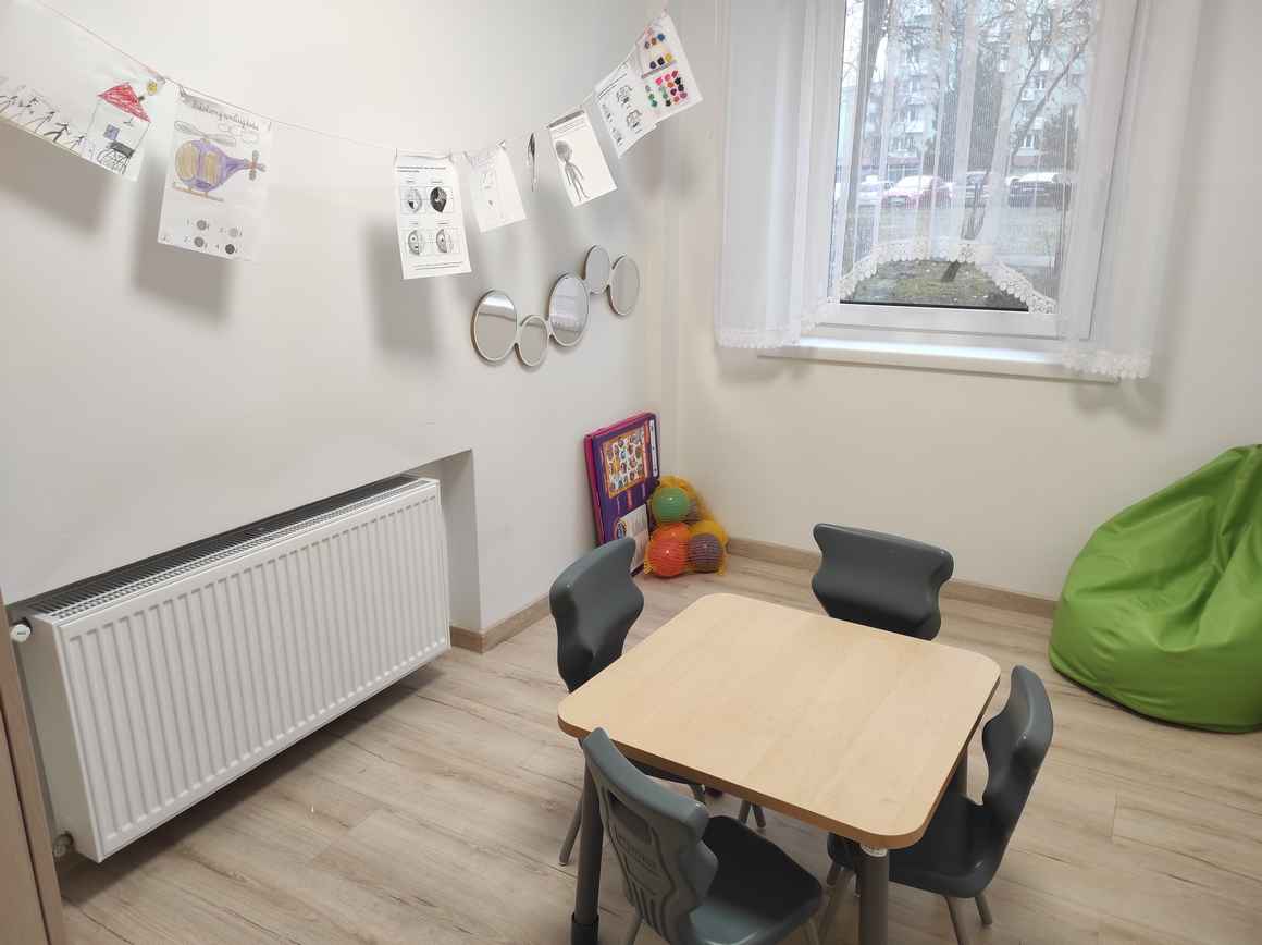 Zajęcia ze specjalistami prowadzone indywidualnie z dzieckiem lub w małych grupach odbywają się w dostosowanym do tego gabinecie.