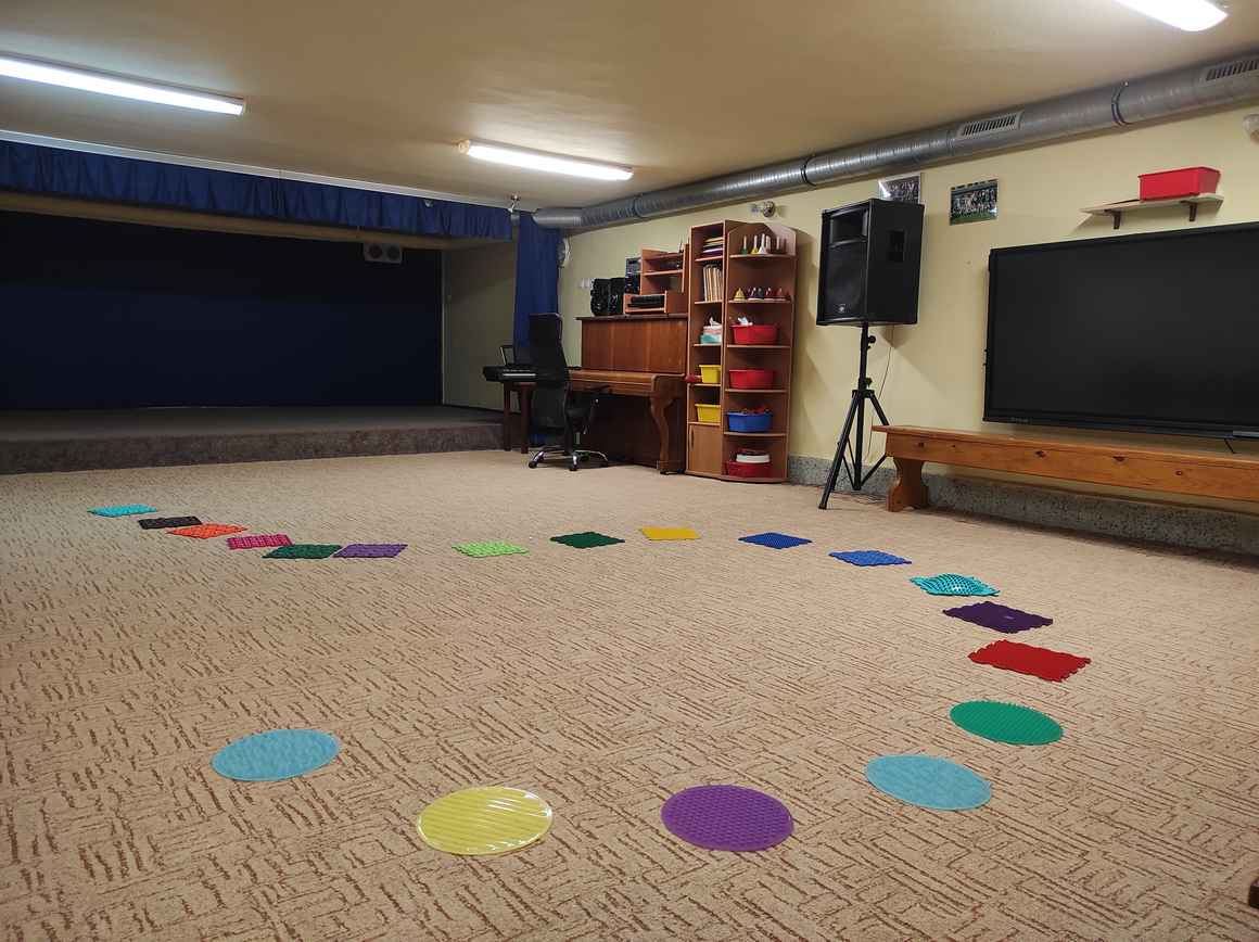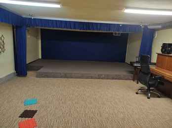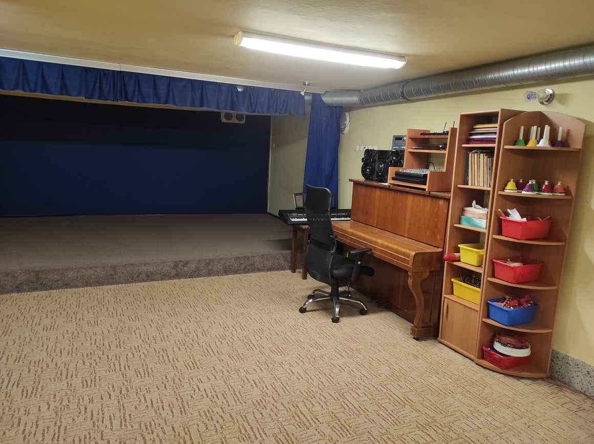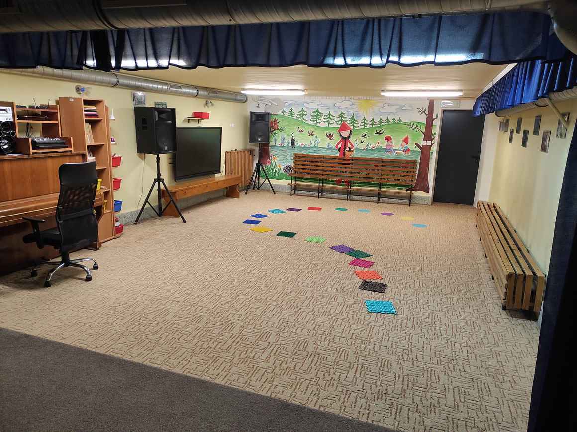 Na uroczystości przedszkolne i występy artystyczne przeznaczona jest sala teatralna, odbywają się tutaj także zajęcia z rytmiki i tańca towarzyskiego. Sala wyposażona jest w niezbędny sprzęt audio wizualny jak i w instrumentarium.